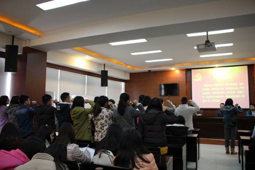2014年12月10日中午,betway88西汉姆联在龙泉校区第二会议室,召开全体学生党员大会,举行预备党员入党宣誓仪式。大会由组织员李佳莉老师主持,学院党总支书记王子华到场讲话。