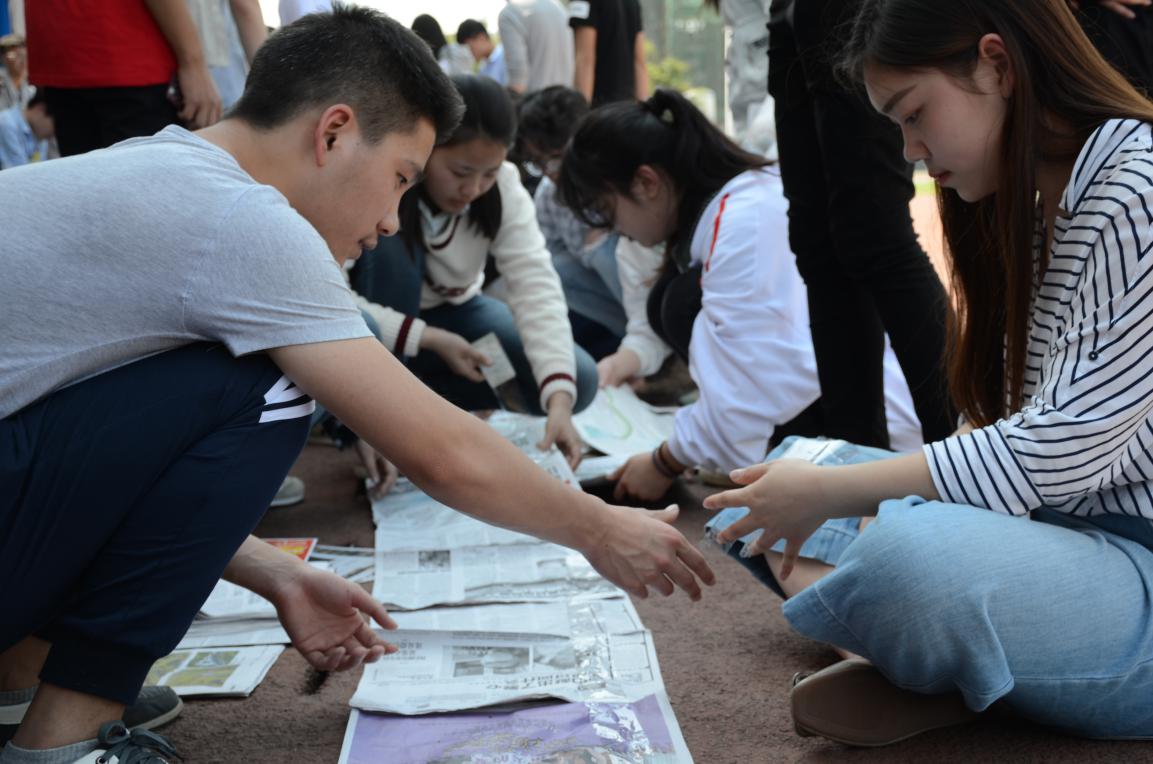 此次比赛参赛班级由汉语言文学、汉语国际教育、社会工作、视觉传达设计四个专业的6个班级组成。比赛项目有“多人报团”、“报纸履带”、“人多足少”、“趣味接力赛”。其中“报纸履带”的响应度最高,此项目需要使用由主办方提供的订书机、双面胶或透明胶把废旧报纸拼贴出一个圆环,参赛者进入其中并进行走动,过程中报纸不得出现报纸损坏。尽管气温不断升高,但各班参赛者仍齐心协力,制作报纸履带。他们在比赛中体现出的强大凝聚力和团结一致的精神,赢得了观众的一片欢呼。