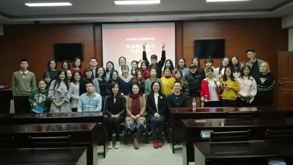 10月27日晚19:00,betway88西汉姆联2015级汉语国际教育专业教学实习出征仪式在龙泉校区一教二楼会议室举行,欢送即将奔赴北京汉友通国际教育公司、成都美和汉语公司、四川大学国际教育学院进行专业教学实习的同学们。院长廖思湄、党总支书记陶若铭、班导师刘洁、辅导员黄炼、汉语国际教育教研室主任许有平、副主任王冠、汉语国际教育专业2015级全体同学参加出征仪式。