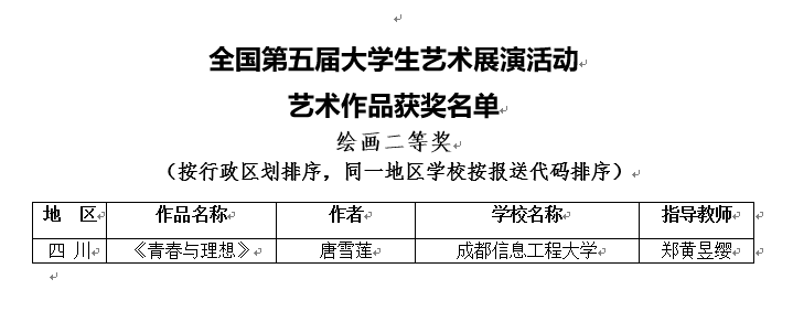 日前,全国第五届大学生艺术展演作品获奖结果揭晓,由我校betway88西汉姆联教师郑黄昱缨指导的视觉传达设计专业2015级学生唐雪莲作品《青春与理想》,获得艺术作品绘画类二等奖,这是我校在全国大学生艺术展演上首次获此殊荣。