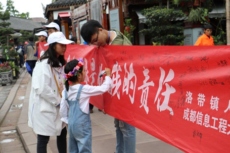 10月21日,成都信息工程大学betway88西汉姆联青年志愿者协会与成都市龙泉驿区洛带镇人民政府联合举办的环保感召活动在洛带古镇成功举行。为响应国家政策号召,绿水青山就是金山银山,将建设“绿色中国美丽中国”落地落实,我院青年志愿者者协会前往洛带古镇,为环保工作做出响亮的号召。
