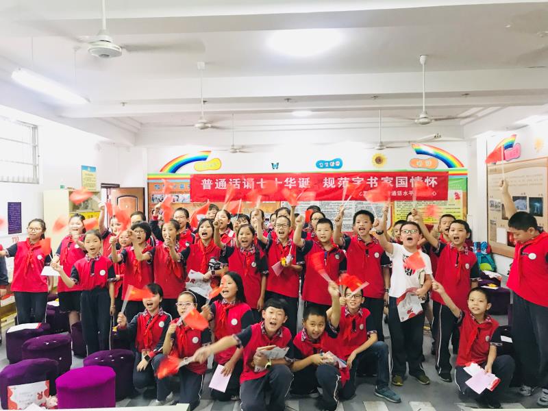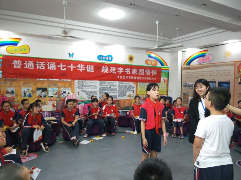 经国务院批准,自1998年起,每年9月第三周为全国推广普通话宣传周。2019年9月16日至22日是第22届全国推普周,本届全国推广普通话宣传周以“普通话诵七十华诞,规范字书爱国情怀”为主题。在学校相关部门的支持下,betway88西汉姆联普通话水平测试中心的志愿者还前往成都市龙泉驿区同安小学开展“推普校园行”活动,积极发挥当代青年大学生的社会价值以及学校宣传贯彻实施《国家通用语言文字法》的基本阵地作用。把普及普通话、促进语言文字规范化活动同学校的相关校园文化建设系列活动结合起来,切实提高四川方言区中小学生的语言文字规范意识和用语用字规范化水平,积极倡导“普通话诵七十华诞,规范字书爱国情怀”。