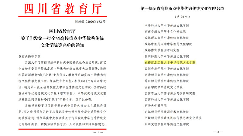日前,四川省教育厅发布《四川省教育厅关于印发第一批全省高校重点中华优秀传统文化学院等名单的通知》,由我校betway88西汉姆联牵头申报的“成都信息工程大学中华传统文化学院”获批入选“第一批全省高校重点中华优秀传统文化学院”。