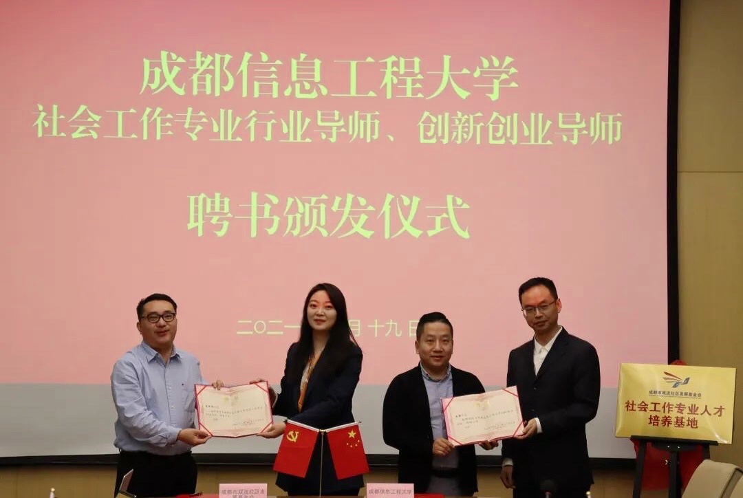 随后为成都市双流社区发展基金会理事长朱九林颁发《成都信息工程大学社会工作专业行业导师》聘书