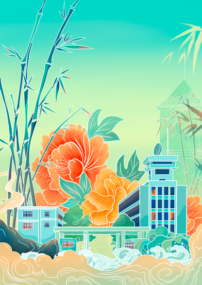 《成信碧源山水图》插画主要以校园代表建筑与山水景观进行结合,体现校园的环境氛围。画面通过学校代表性的钟楼以及图书馆等场景的描绘,体现学校的人文情怀,也展现学校坚持“以人为本,追求卓越”的办学理念,钟楼指针正好指向17:51,代表了建校的1751年。将学校的荷花池及乾坤魂与宋代青瓷碗相结合,体现了中华民族特有的文化精髓和审美情趣。飞行器、飞机、龙泉山脉等一些元素表现了学校大气学科和航空港及龙泉两校区地理位置。整体画面具有一定的视觉效果,展现了优美的校园风采,诠释了优秀的校园文化。