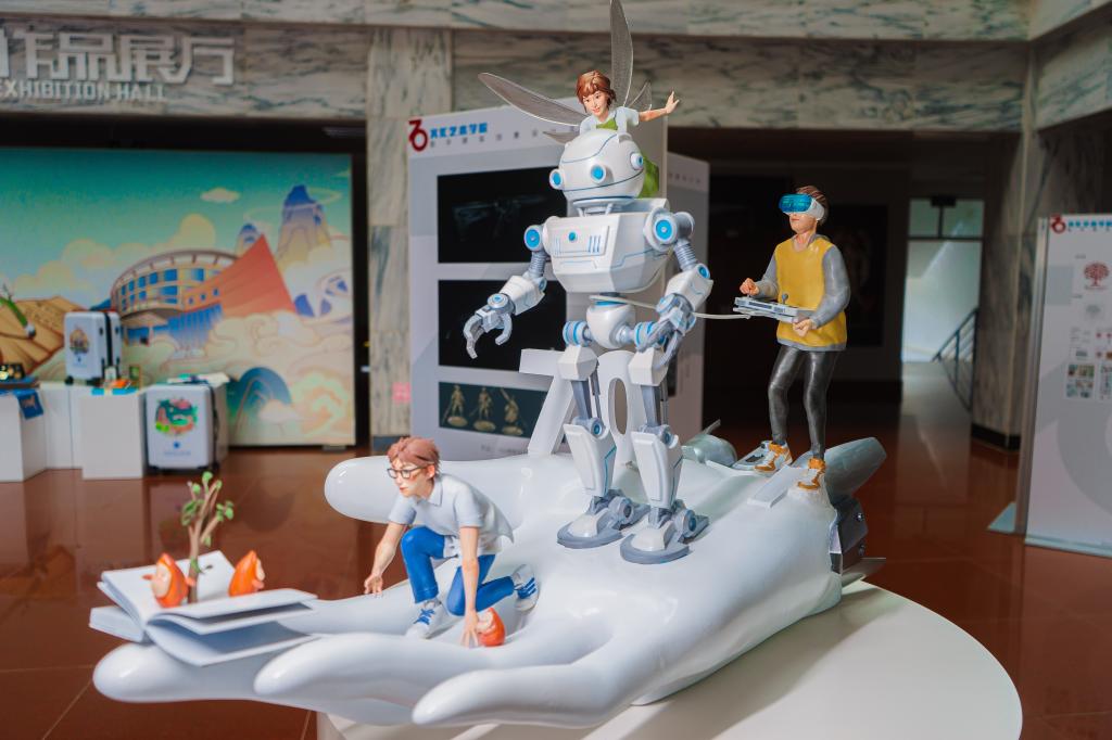 《托举70周年》采用3D打印技术制作,带推进器的大手代表进取的学校,承载学生们的梦想与未来;机器人代表未来的人工智能时代;天上飞的女生代表人文类专业,赋予机器人灵魂与思想;前面的眼镜男孩代表大气、资环等专业,起到领头人的作用,同时保护银杏树下的小果仁;后面拿控制器的黄衣男孩代表计算机、电子信息工程等技术类专业,是未来的制造者。