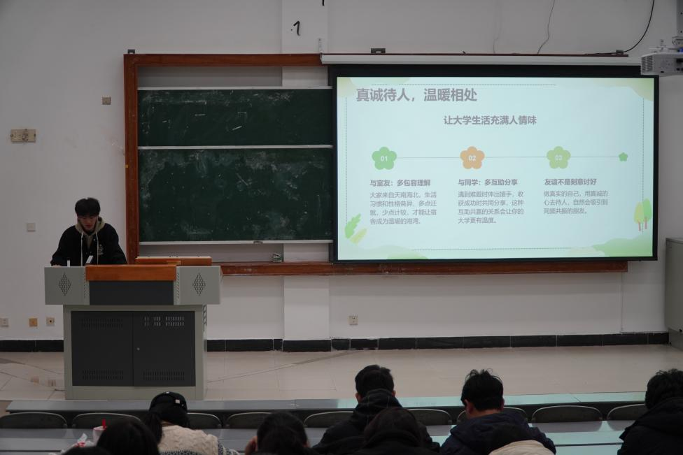 何银平同学则聚焦新生入学适应的痛点,从心理调适与时间管理两大维度给出针对性建议。针对初入校园易滋生的迷茫与焦虑情绪,他分享了科学有效的心理疏导方法,引导新生悦纳自我、从容适应;围绕如何高效利用学习时间、平衡社团活动与专业学习的关系,他提供了切实可行的时间规划策略;此外,他还围绕寝室人际关系处理、自律习惯养成、身心健康维护等新生关注的话题,倾授诸多实用技巧。