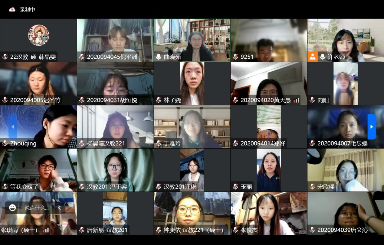 讲座结束后,同学们就讲座内容、研究热点、面向各级水平中文学习者教学设计等进行线上提问。曲晓茹对大家提出的问题均作了详细解答,并鼓励同学们在讲座结束后进行深度交流。