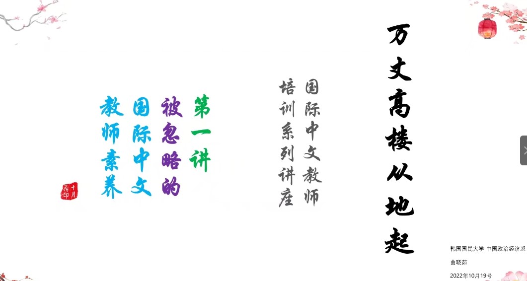 2022年10月19日晚,应我院邀请,韩国国民大学副教授曲晓茹博士在腾讯会议作“国际中文教师培训系列讲座——被忽略的国际中文教师素养”学术讲座,我院汉语国际教育专业师生参加讲座,讲座由文化传播与教育实验室主任许有平主持。