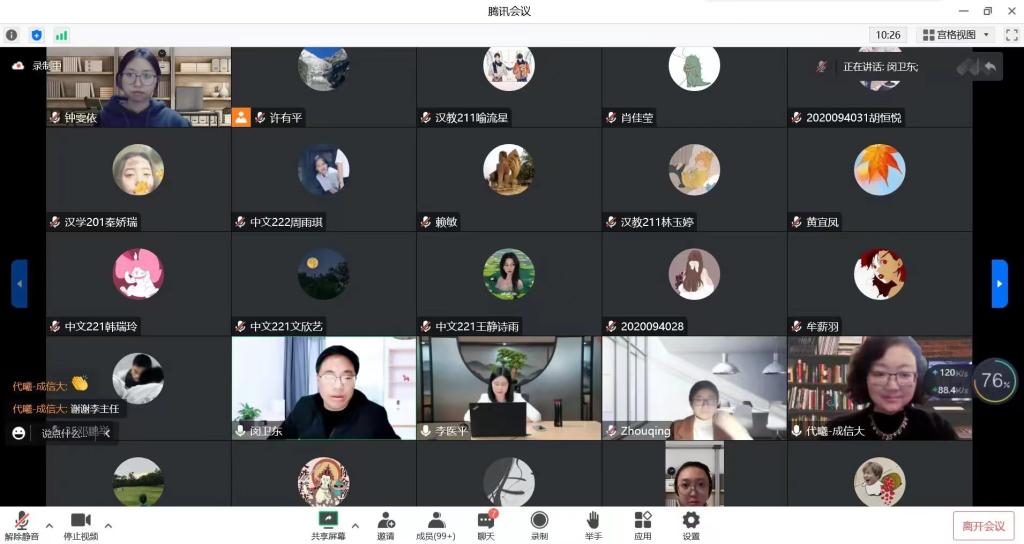 11月23日晚,老挝中国文化中心李医平主任应我院邀请作了一场“讲中国故事,传盛世强音——对外文化交流叙事方式的实践探索”的线上学术讲座,学院党委书记闵卫东、院长代曦和中国语言文学专业全体师生参加了讲座,讲座由闵卫东主持。