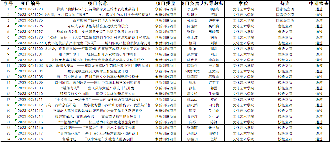 我院2023年大学生创新创业训练计划项目中期检查共有26项参加,其中24项通过,2项终止。(下图为通过项目)
