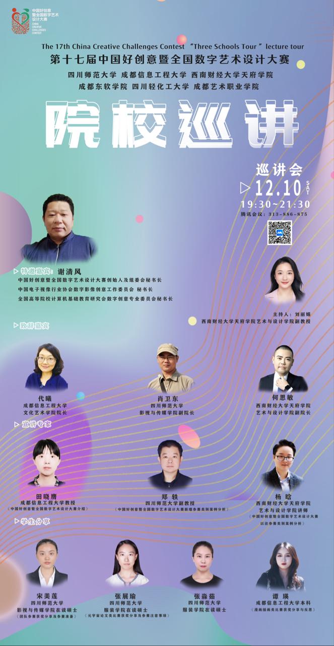 2022年12月10日,第十七届中国好创意暨全国数字艺术设计大赛巡讲会以线上会议的方式成功举行。此次院校巡讲特别邀请到中国好创意暨全国数字艺术设计大赛创始人及组委会秘书长谢清风老师致辞,巡讲对象涵盖了成都信息工程大学、四川师范大学、西南财经大学天府学院、成都东软学院、四川轻化工大学、成都艺术职业学院六所院校。各位致辞嘉宾及、宣讲专家、以及优秀学生的讲解和分享,使与会师生对大赛有了更加深刻的认识、调动了六校师生参与到大赛中来的积极性。本次巡讲会共有三个议程。