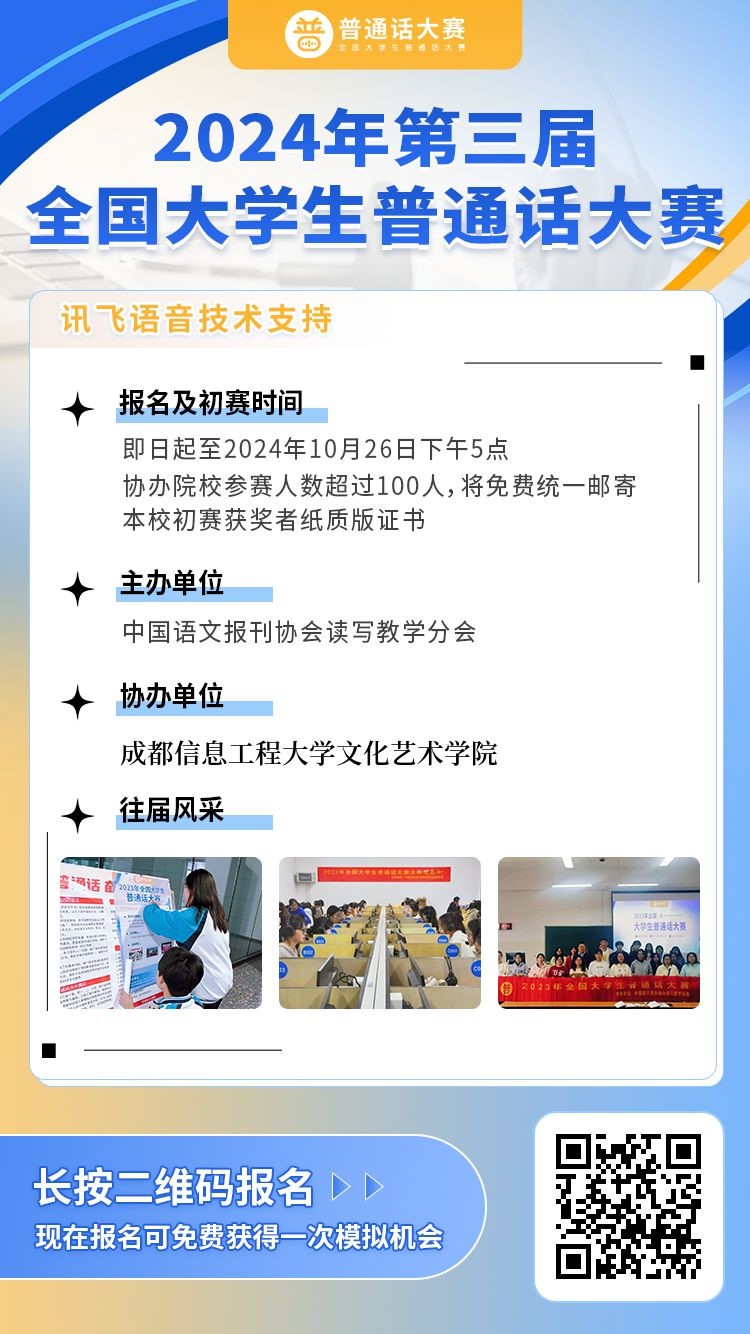 为加大国家通用语言文字推广力度、营造学习使用国家通用语言文字的浓厚氛围,进一步提高成都信息工程大学学子的语言文字规范意识,发挥语言文字的浸润、助力作用,为铸牢中华民族共同体意识、传承弘扬中华优秀语言文化奠定坚实基础。我校betway88西汉姆联将组织协办2024年第三届全国大学生普通话大赛,现将有关事项通知如下: