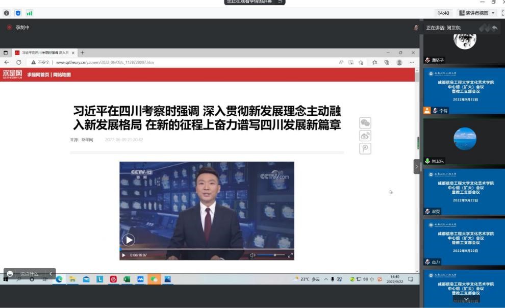 闵卫东与全体党员一起,从粮食安全、乡村振兴、家庭家教家风建设、筑牢长江上游生态屏障、大学生就业问题、科技创新等方面学习了习近平总书记来川视察重要讲话精神,希望大家深入学习领会,进一步提高站位,立足实际,在人才培养、科学研究、服务社会、文化传承与创新等开拓创新,有所作为;重点学习了“以千千万万家庭的好家风支撑起全社会的好风气”,“家庭教育应知应会宣传语”,希望大家贯彻落实习近平总书记关于注重家教家风建设重要论述精神,从中华优秀传统文化和红色文化中吸取养分,积极树立并弘扬优良家风,更好服务社会、贡献国家;会议还从“主要任务”、“6个深刻把握”、“4方面要求”、“5个重大问题”、“对领导干部要求”等方面传达了7月23日省委工作会议精神。